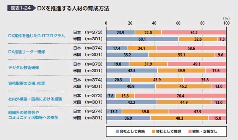 日本のDXを推進する人材の育成方法は、「実施・支援なし」が全項目で4割から7割と割合が高い。米 国では「DX案件を通じたOJTプログラム」が6割を超えるほか、その他の取組もおおむね30%から40%台 である(図表1-24)。日本で育成を会社として実施している割合が最も高いのは「DX案件を通じたOJTプ ログラム」が23.9%であり、DXの推進人材の育成施策を会社として取組む姿勢に日米で大きな差が出 ている。