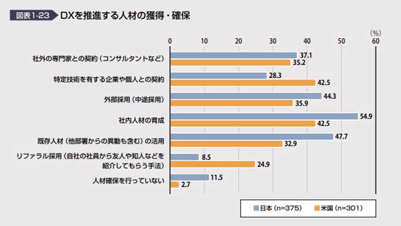 DXを推進する人材の獲得・確保の取組の状況としては日米ともに「社内人材の育成」(54.9%、 42.5%)の割合が一番高い(図表1-23)。日本と米国の差異をみると米国は、日本より「特定技術を有する 企業や個人との契約」(42.5%)、「リファラル採用(自社の社員から友人や知人などを紹介してもらう手 法)」(24.9%)などさまざまな社外からの獲得手段の割合が高く、日本企業もこのような手段を積極的に 活用していくことが必要と考える。