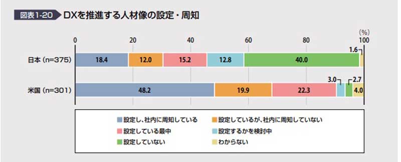 DXを推進する人材について、人材像を設定し、社内に周知しているかを尋ねた結果を示す(図表 1-20)。人材像を「設定し、社内に周知している」割合は日本では18.4%、米国では48.2%、「設定していない」 割合は日本では40.0%を占め、米国の2.7%に対する大きな差が見られる。人材像が明確になっていない ことが人材の獲得・確保において「戦略上必要なスキルやそのレベルが定義できていない」「採用した い人材のスペックが明確でない」などの課題につながっていることから、日本企業はこの取組の遅れを 認識し、早急に取組む必要がある。